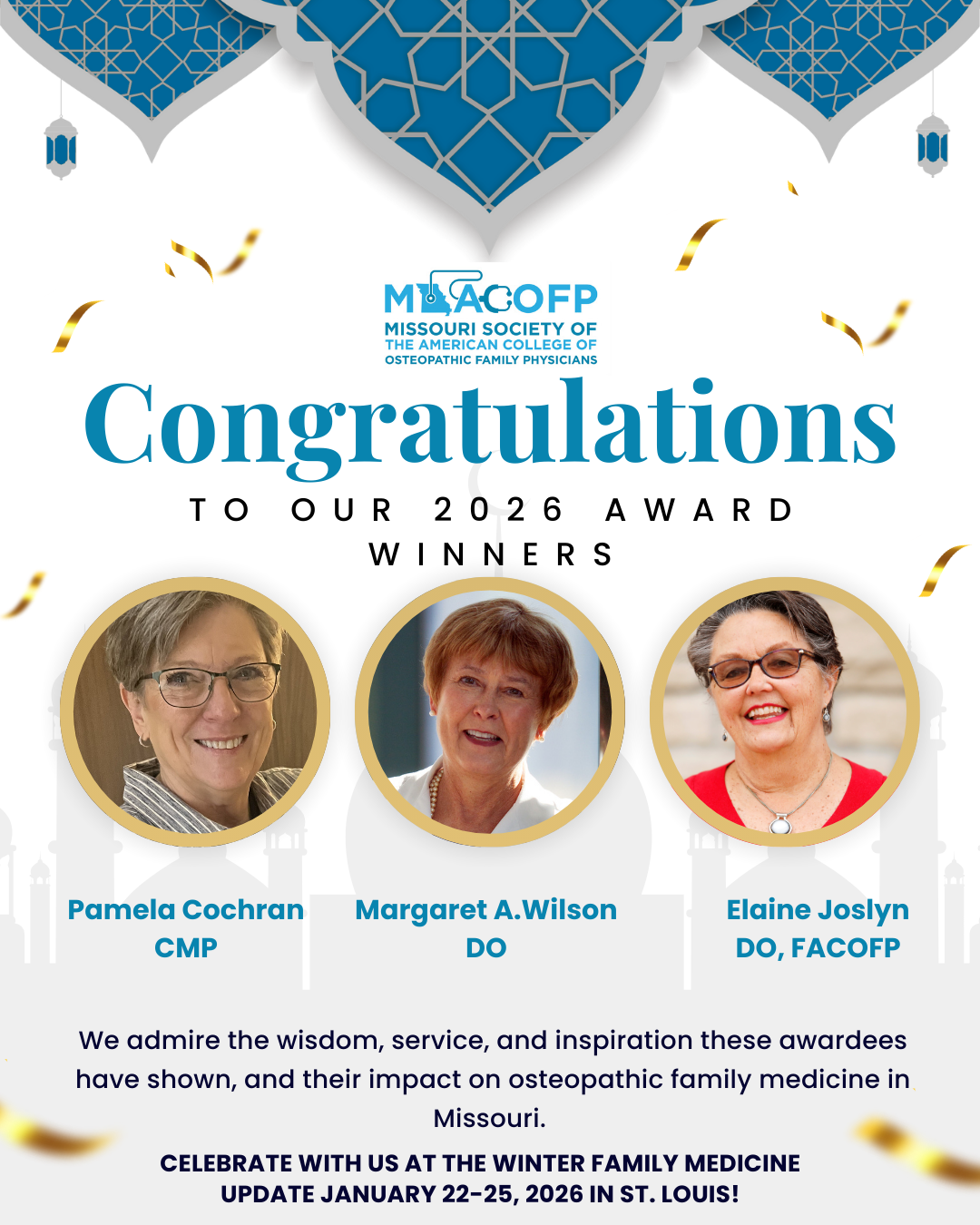 Margaret A. Wilson, DO, is the 2026 MSACOFP Osteopathic Family Physician of the Year! Dr. Wilson is Dean of the A.T. Still University Kirksville College of Medicine and Professor of Family Medicine. She has served the Kirksville community for decades and shaped the Missouri family medicine workforce in immeasurable ways. Elaine Joslyn, DO, FACOFP is the 2026 Outstanding Female Physician of the Year! Dr. Joslyn's inspiring career has spanned academic medicine, serving as both a residency program director and department chair at Kansas City University College of Osteopathic Medicine, private practice in an underserved community, and founding and growing a non-profit to care for uninsured and underinsured patients. Pamela Cochran, CMP is selected for the 2026 James A. DiRenna, Sr. Appreciation Award for her significant contributions to osteopathic family medicine and MSACOFP. A nonprofit management executive and certified meeting planner, she is the former executive director of MSACOFP and worked diligently to grow the organization and its Winter Family Medicine Update, even amidst a pandemic. Celebrate with these inspirational professionals at the Winter Family Medicine Update January 22-25, 2026, in St. Louis!